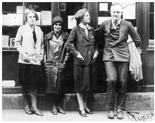De izd. a dcha.: Myrsine y Helene Moschos, Sylvia Beach and Hemingway en frente de la librería Shakespeare & Co. propiedad de Beach.