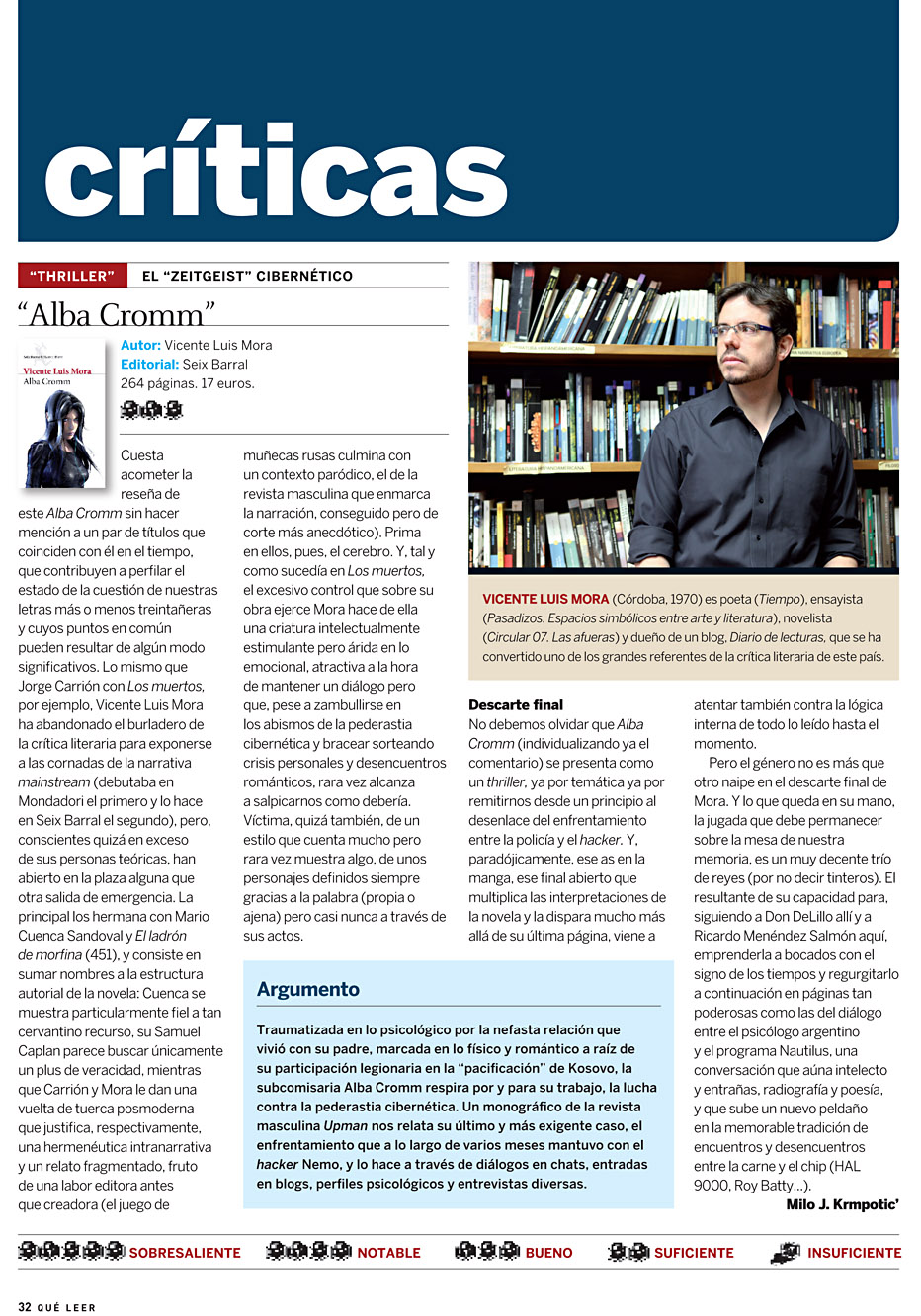 ALBA CROMM es una novela con sus aciertos y sus tropiezos. Creo que la crítica menciona ambos. Y sí, el balance es positivo. ¿Eso me ha valido el ingreso en Seix Barral? Lástima no haberlo sabido en su momento, porque por dos tinteros más igual me daban un cargo vitalicio.