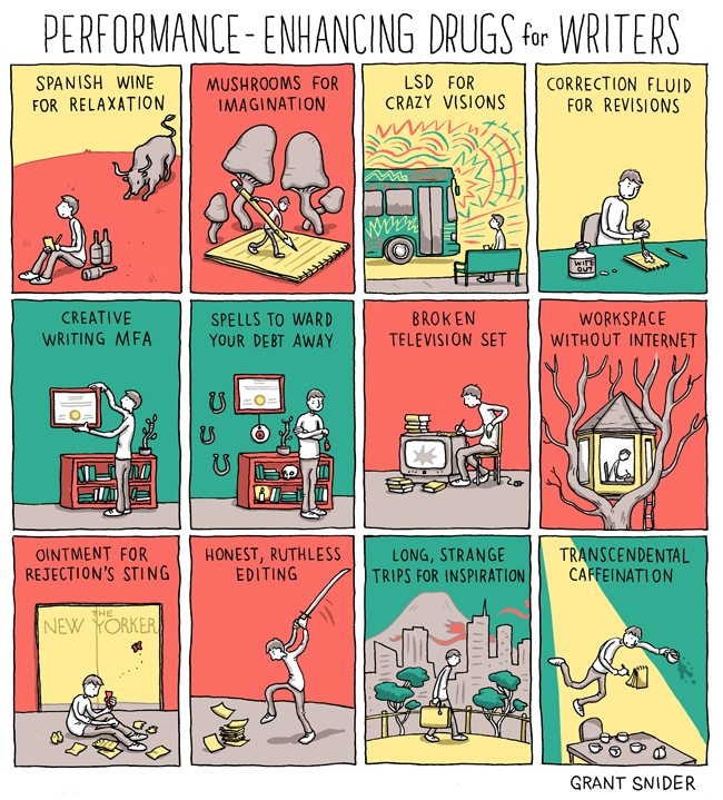 1.- Vino español para relajarse. 2.- Setas para la imaginación. 3.- LSD para visiones disparatadas. 4.- Tipp-ex para las correcciones. 5.- Master de escritura creativa (MFA= Master in Fine Arts). 6.- Conjuros o amuletos para ahuyentar las deudas. 7.- Una televisión rota. 8.- Un lugar de trabajo sin internet. 9.- Pomada para el resquemor que producen los rechazos. 10.- Honesta y despiadada autocrítica. 11.- Largos y extraños viajes para la inspiración. 12.- “Cafeinización” transcendental. (Juego de palabras con Meditación transcendental y café).