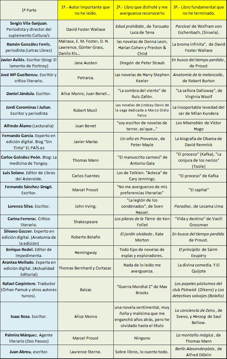 Aquí, más abajo, [Hay que pinchar sobre la palabra «libros» para descargar un PDF o en la imagen para ampliar la foto del excel] los primeros 20 encuestados. En otro “post”, que espero publicar esta tarde, la segunda tanda de participantes y nuestros comentarios.
