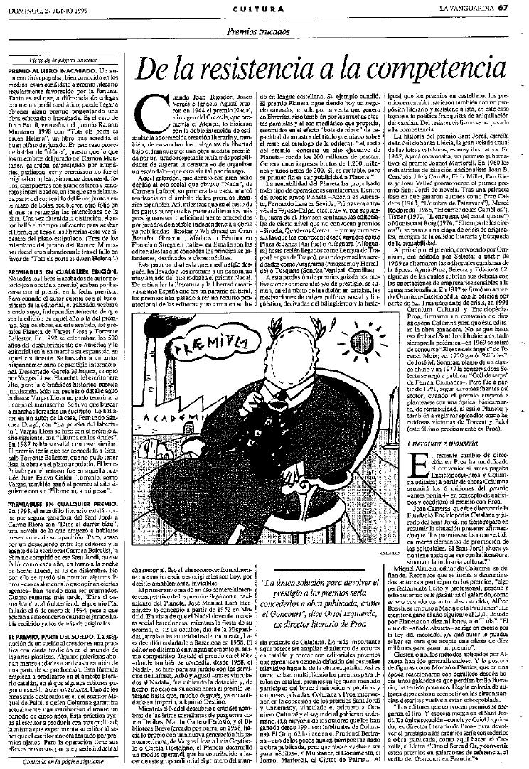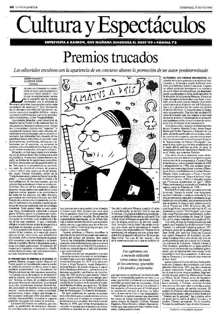 El domingo 27 de junio de 1999 amaneció especialmente caluroso en la ciudad condal. Sin rastro de nubes, y con numerosos pajaritos cantando con alegría y desparpajo desde la mañana bien temprano, Barcelona se disponía a iniciar una nueva jornada. Como todos los días, los quioscos de prensa abrieron sus puertas y pusieron a disposición del público una amplia variedad de periódicos y revistas. En dichos establecimientos, también como todos los días, se adquirió –en aquella época la prensa escrita aún se vendía de forma masiva- un buen número de ejemplares de La Vanguardia, el diario con mayor difusión de Cataluña. Aquella jornada alegre y festiva, en las páginas 66, 67 y 68 (aquí) , (aquí) y (aquí) [hemeroteca de La Vanguardia] de aquel ejemplar de la publicación del conde Godó sus numerosos lectores pudieron disfrutar de un largo artículo titulado Premios trucados. Lo firmaban Llatzer Moix y Josep Massot. Era domingo, se disponía de tiempo para leer y el sol brillaba.
