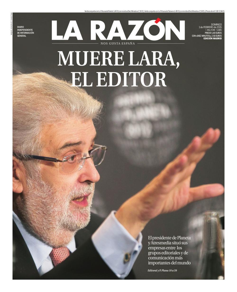 El fallecimiento próximo de José Manuel Lara Bosch -por desgracia- era una noticia ya conocida desde hacía tiempo. El mismo editor decía que en 2011, después de una complicada intervención quirúrgica motivada por un avanzado cáncer de páncreas, había vuelto a nacer. Se le pueden criticar a Lara muchos proyectos y muchas decisiones, pero es de justicia reconocer, sin riesgo a errar por exageración, que se trata de la figura más importante de la edición literaria y de los medios de comunicación en la España de los últimos 30 años. Sin Lara todo hubiera sido muy diferente, seguro que peor. La prensa tuvo tiempo de sobra para preparar la cobertura que iba a dar al asunto (vean como ejemplo el magnífico despliegue de LA RAZÓN hoy). Por todo esto es destacable el pobre tratamiento que medios como EL PAÍS o el ABC dan al fallecimiento del gran editor.