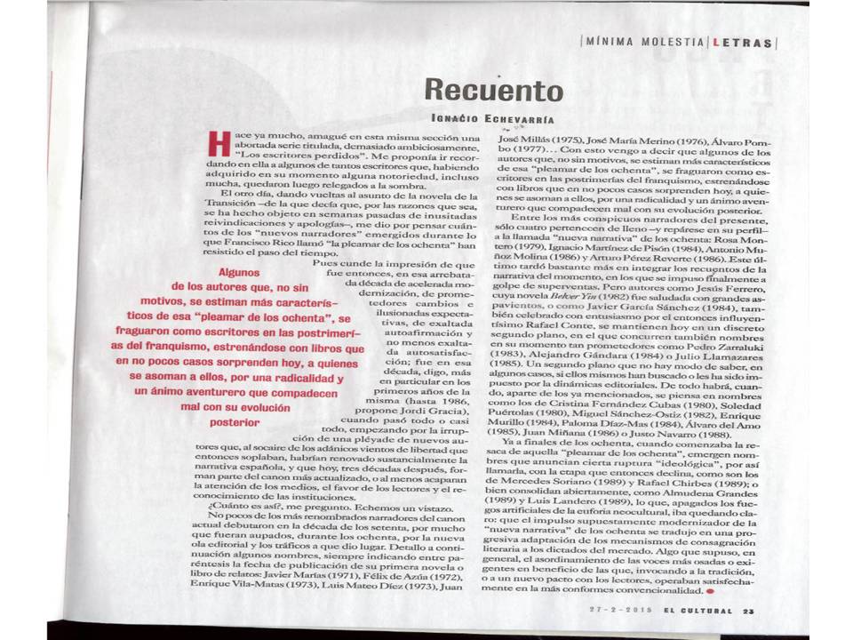 Nota: aquí abajo pueden leer el articulito, «Recuento», de Echevarría en EL CULTURAL a que nos referimos arriba. Se encontrarán con otra más de las típicas piezas del Echevarría de los últimos años: un tirón de la oreja, pero sin que duela mucho. Que se vea que sé mucho (más de lo que escribo), pero que nadie se enfade demasiado conmigo.
